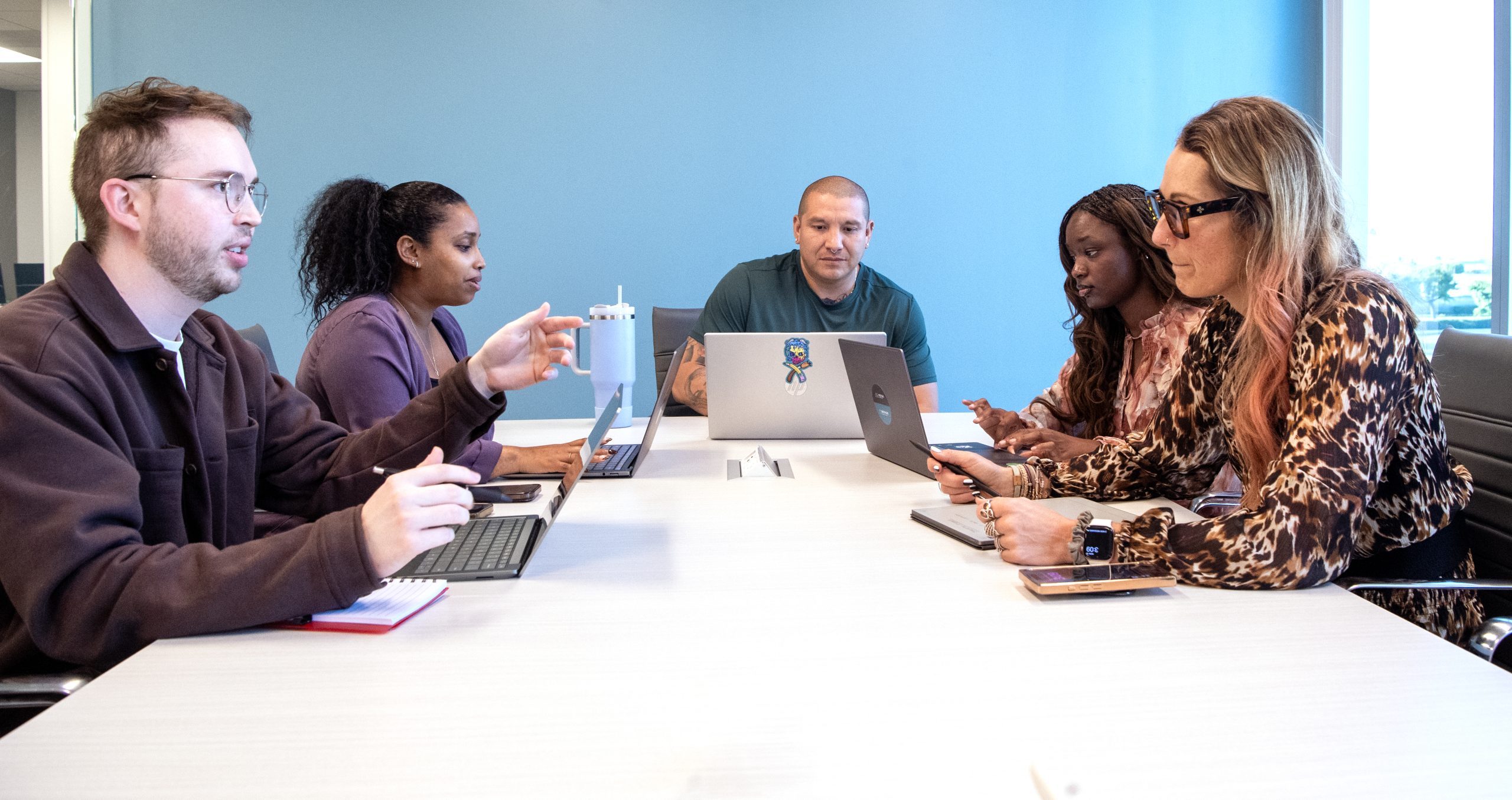 Merge Opportunities staff convene in the organization’s conference room for a team meeting. Left to right: Kevin Somo, Haben Berhe, Ricky Gonzalez, Dymond Bell, and Erin Earlywine.