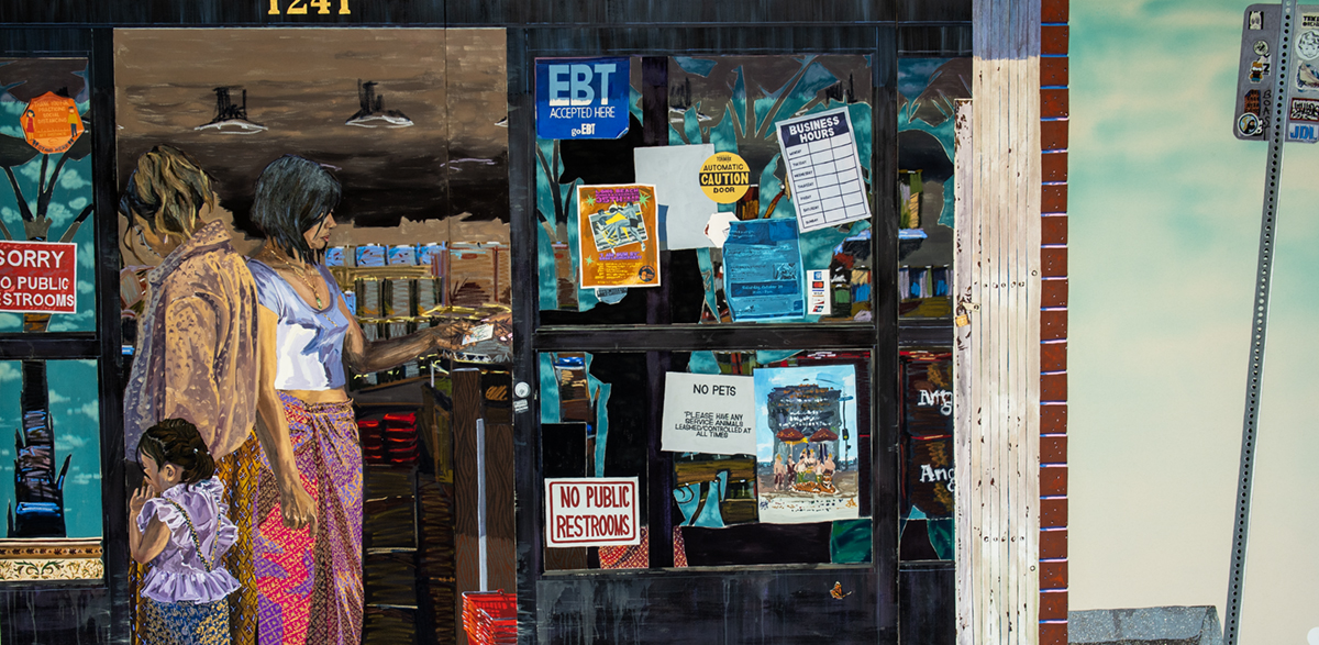 Lek said she’ll take tons of pictures of anything she might want to paint and look through them later for ideas. The three-paneled painting depicts the front of a convenience store, complete with sign-covered windows, and just inside the open door, a woman reaching across the counter to pay an unseen cashier – and it’s a real place, the Dong Mai Market at the corner of Anaheim and Orange avenues.
