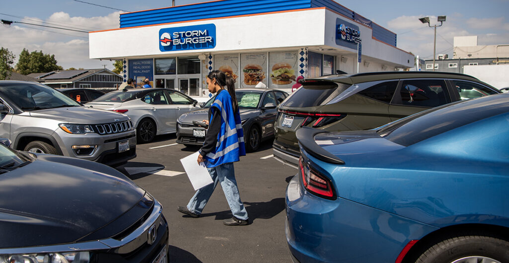 Bree Douglas takes orders as cars line up at Storm Burger in North Long Beach on Tuesday, March 10, 2026. Photo by Thomas R. Cordova.
