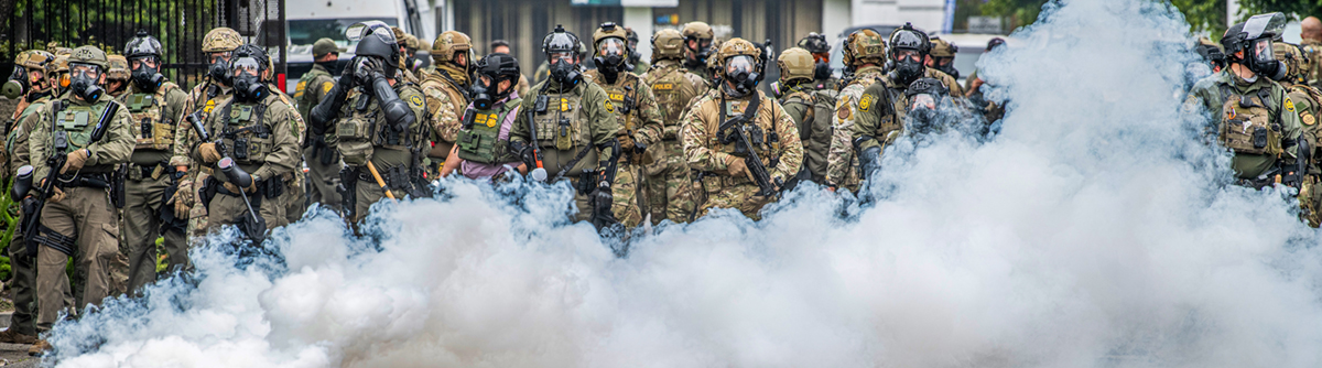 Federal agents maintained their position against protesters as smoke drifted by in Paramount on Saturday, June 7, 2025. Violent confrontations erupted following reports of an immigration raid near a local Home Depot. The standoff lasted for hours, with multiple Border Patrol agents donning gas masks and helmets forming a line opposite the demonstrators. Some protesters tried to disrupt the operation, rushing to the area to join the growing crowd. Photo by Thomas R. Cordova.