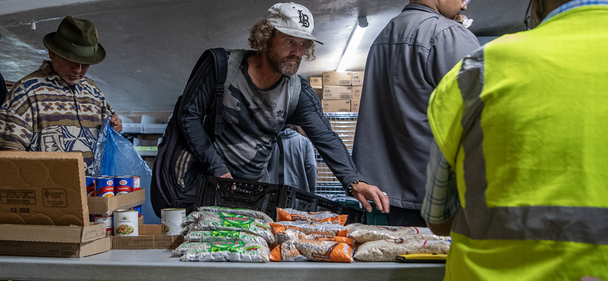 Jesse Abrego reaches for a bag of oatmeal as he picks out his groceries for the day at the Christian Outreach in Action food bank in Long Beach on Thursday, Nov. 6, 2025. As SNAP benefits falter, Long Beach confronts crushing food demand with lines out the door, countless first-time families and emergency distribution centers, pantries and churches consider how long they can keep people fed. Photo by Thomas R. Cordova.