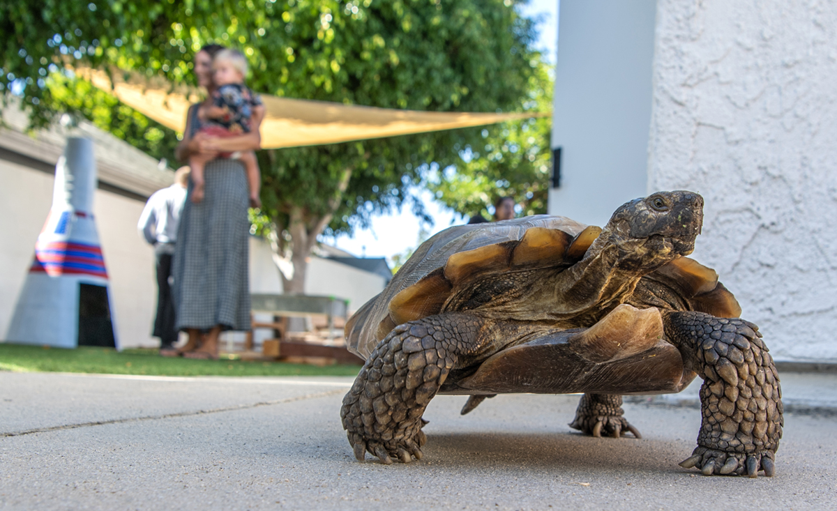Cece, a 30-year-old tortoise, makes her way across the campus at Great Beginnings Preschool in Long Beach, Tuesday, July 30, 2025. The tortoise is one of two at the preschool, which was scheduled to close after nearly 50 years in Long Beach until a local couple stepped in to save it. Photo by Thomas R. Cordova.