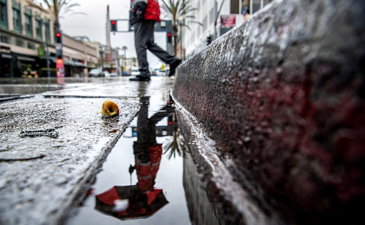 A puddle reflects a pedestrian on Pine Avenue as a rainstorm passes through Long Beach on Friday, March 14, 2025. Photo by Thomas R. Cordova.