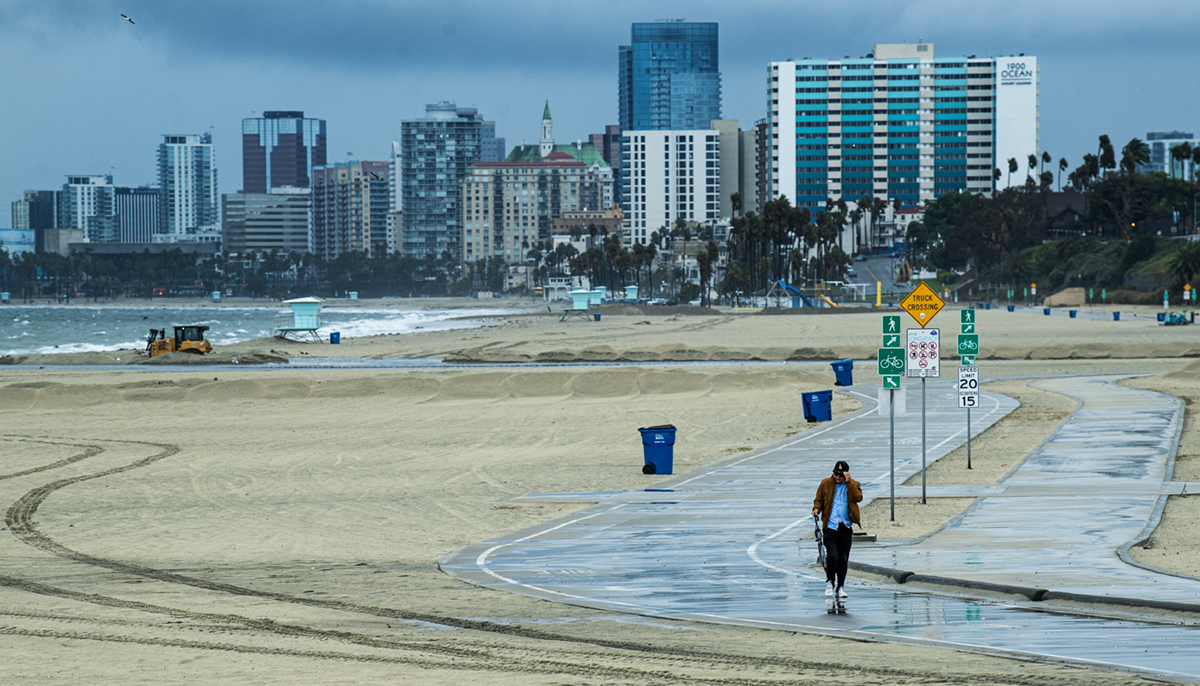 A man clings to his hat as strong winds pick up due to a rainstorm while walking along the beach trail near Veterans Memorial Pier in Long Beach on Tuesday, Oct. 14, 2025. Photo by Thomas R. Cordova.