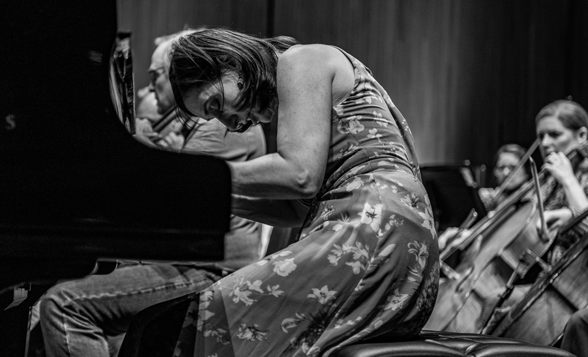Sivan Silver, part of the Silver-Garburg Piano Duo, performs during a rehearsal with the Long Beach Symphony in their Classical Series, Beethoven & Beyond, at the Long Beach Terrace Theatre on Thursday, October 30, 2025. Photo by Thomas R. Cordova.
