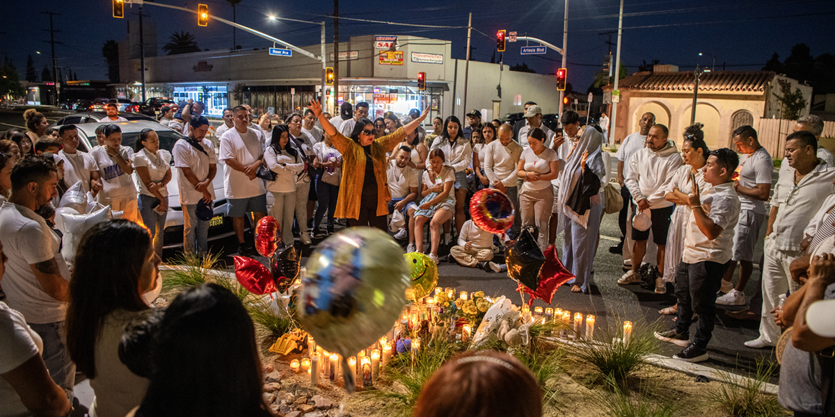 The community gathered for a vigil for the 3-year-old boy who ran into the street and was fatally struck by a vehicle in Long Beach on Monday, Sept. 8, 2025. Photo by Thomas R. Cordova.