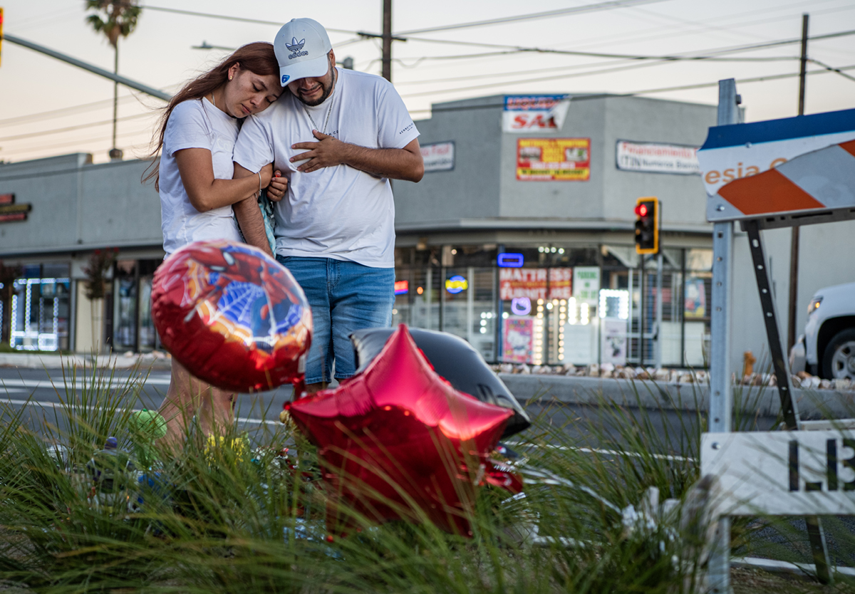 Brandon and Carolina Hernandez Perez stand at the spot where their 3-year-old son was fatally struck by a vehicle in Long Beach, on Monday, Sept. 8, 2025. Police say Noah Hernandez Perez ran onto Artesia Boulevard near Rose Avenue around 6:30 p.m. Saturday. Paramedics rushed the small boy to the hospital, but he soon died from his injuries. Photo by Thomas R. Cordova.