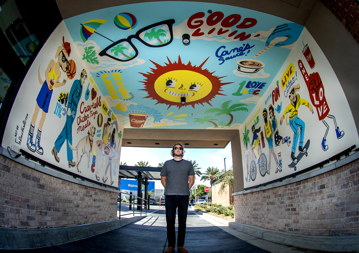 Famed Long Beach muralist Dave Van Patten stands in one of two drive-thrus that he painted at the new Raising Cane’s restaurant in Long Beach, Monday, Aug. 25, 2025. Photo by Thomas R. Cordova.