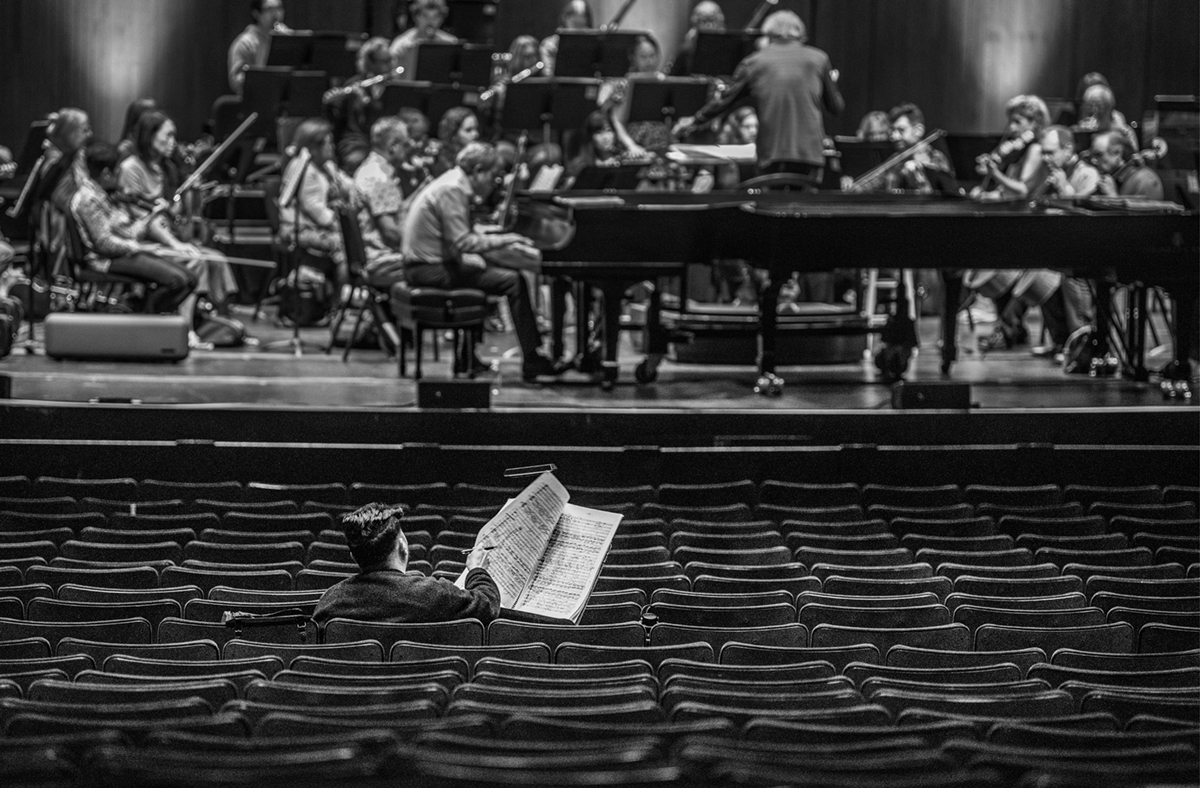Emmanuel Rojas, Conducting Fellow, turns a page of music while sitting in the audience, following along with the Long Beach Symphony during a rehearsal for the Classical Series program titled Beethoven & Beyond at the Long Beach Terrace Theatre on Thursday, Oct. 30, 2025. Photo by Thomas R. Cordova.