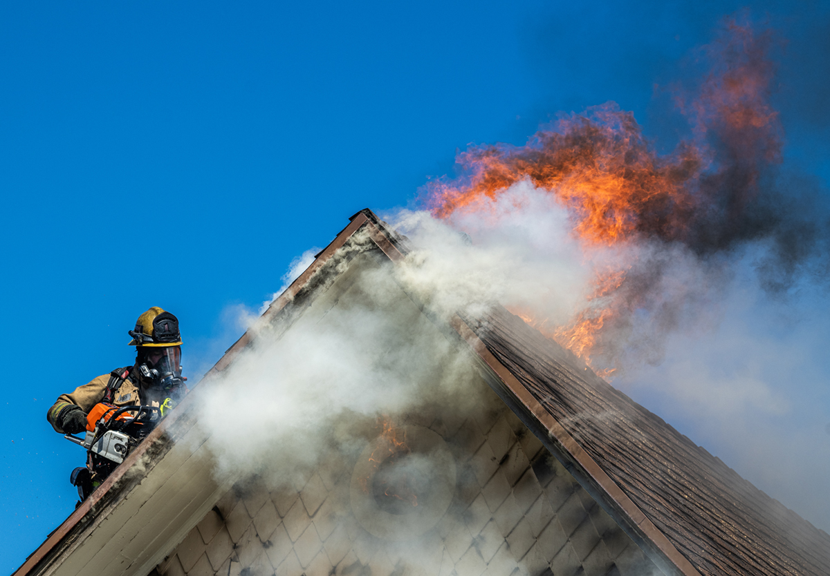 Flames shoot upward out of the attic of a home as a firefighter takes a saw to the roof of a home on Second Street in the Alamitos Beach neighborhood. Long Beach on Wednesday, Sept. 24, 2025. Photo by Thomas R. Cordova.