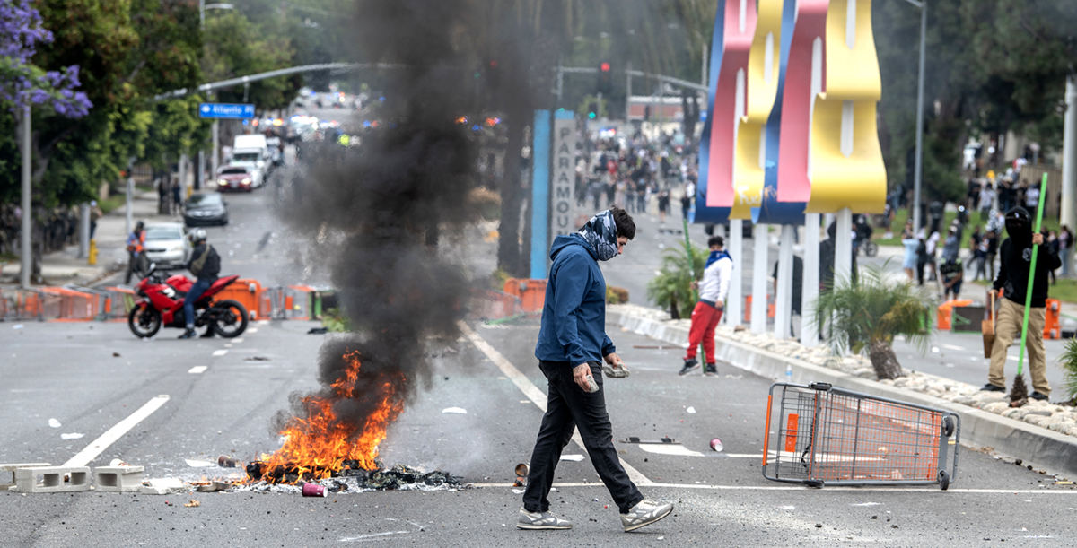 A protester runs across the street as federal agents shoot pepper balls and flash bangs at demonstrators after they gathered because of reports of an immigration raid in Paramount on Saturday, June 7, 2025. Photo by Thomas R. Cordova.
