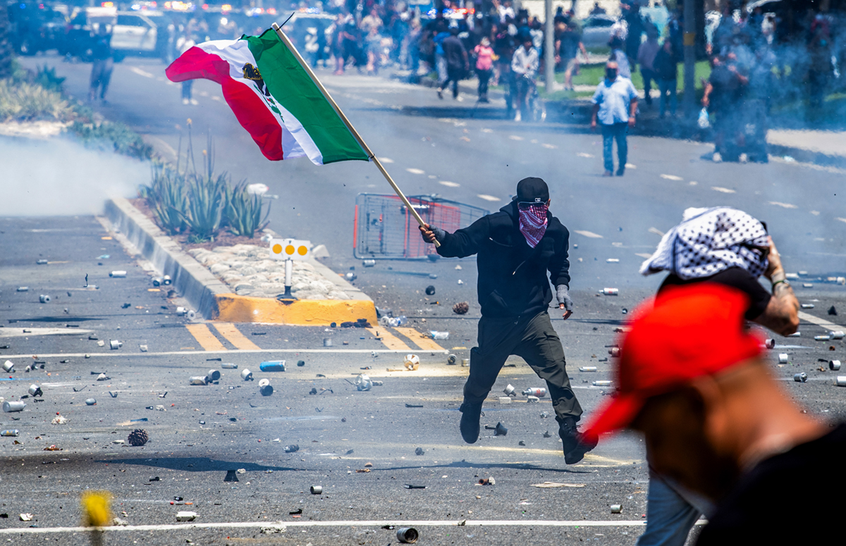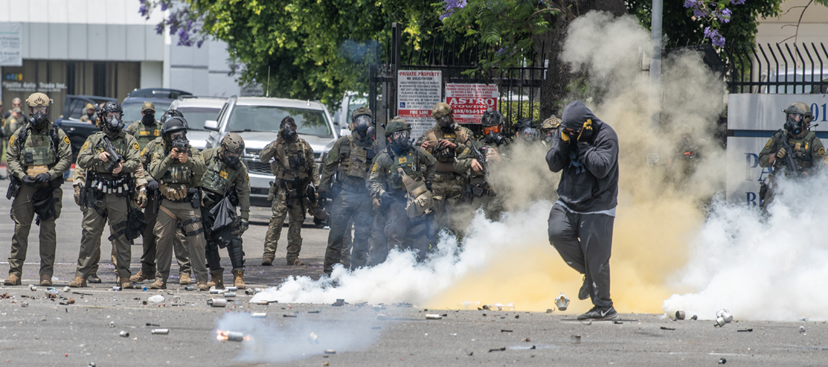 Federal agents deployed flash-bangs and gas on a protester who approached them in Paramount on Saturday, June 7, 2025. The protest erupted after community groups spread the word that Border Patrol agents were using a business park as a staging ground. The event, at the beginning of the Trump administration’s immigration crackdown in Los Angeles County, became a national flashpoint with major implications, including the president’s decision to deploy the National Guard. Photo by Thomas R. Cordova.