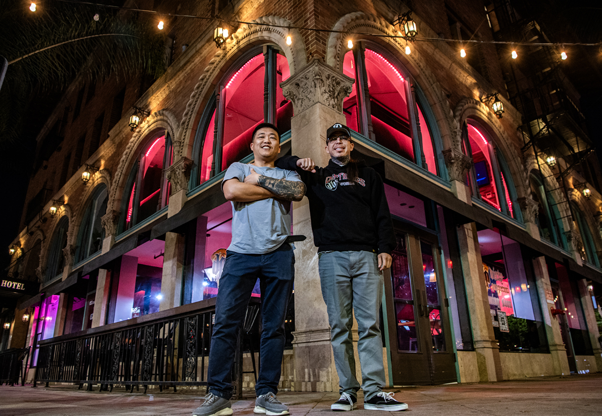 Lev Kim and Mikey Loco, co-owners, stand outside their newly opened pizza restaurant, the Dirty Pepperoni, in Downtown Long Beach on Wednesday, Oct. 23, 2025. Kim and Loco are behind the swirled marble floors, motorcycle headlights that illuminate the dining area, and fanatically tested pizza dough at their new restaurant: Dirty Pepperoni. Photo by Thomas R. Cordova.