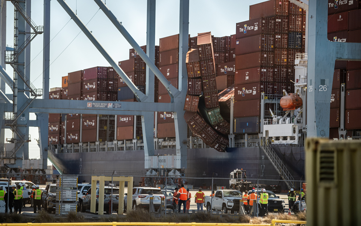 Longshoremen clear the pier as shipping containers fall off the vessel Mississippi in Long Beach on Sept. 9, 2025.