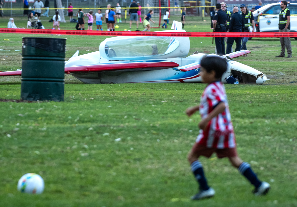 Soccer practice continued after a small plane crashed at Heartwell Park on Tuesday, Oct. 21, 2025. The aircraft crashed into a woman, seriously injuring her, as it made an emergency landing at the park, northeast of Long Beach Airport. Heartwell Park is a hub for youth sports most weeknights, with hundreds of people enjoying the park’s 122.5 acres. Photo by Thomas R. Cordova.