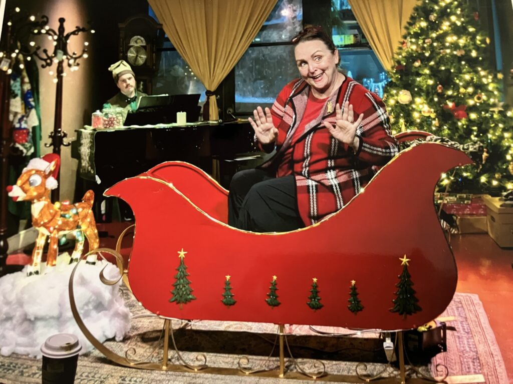 Linda Libby plays a middle-aged woman dressed in red and white trying to inhabit her mother’s shoes as the town’s “Mrs. Christmas” — making crafts and baking cookies in August to freeze for December and spreading cheer by driving an actual sleigh through the streets.