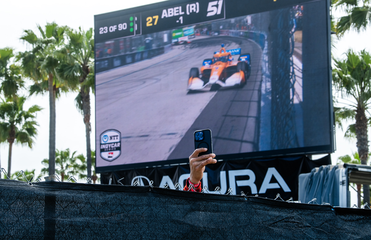 An IndyCar fan records the race from behind a blocked fence at the 50th Acura Grand Prix of Long Beach on Sunday, April 13, 2025. Photo by Thomas R. Cordova.
