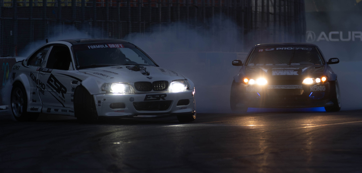 The first round of Super Drift Challenge No. 2 commences on April 12, 2025, with the bleachers and front-row seats filled during the 50th Acura Grand Prix of Long Beach on April 13, 2025. Photo by Samuel Chacko.