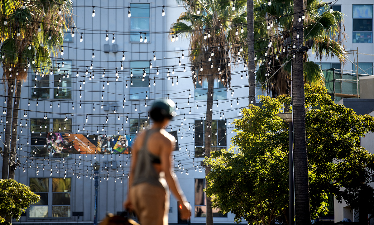 A woman walks across the Mosaic Promenade in Downtown Long Beach, Tuesday, Dec. 12, 2023. Photo by Thomas R. Cordova.