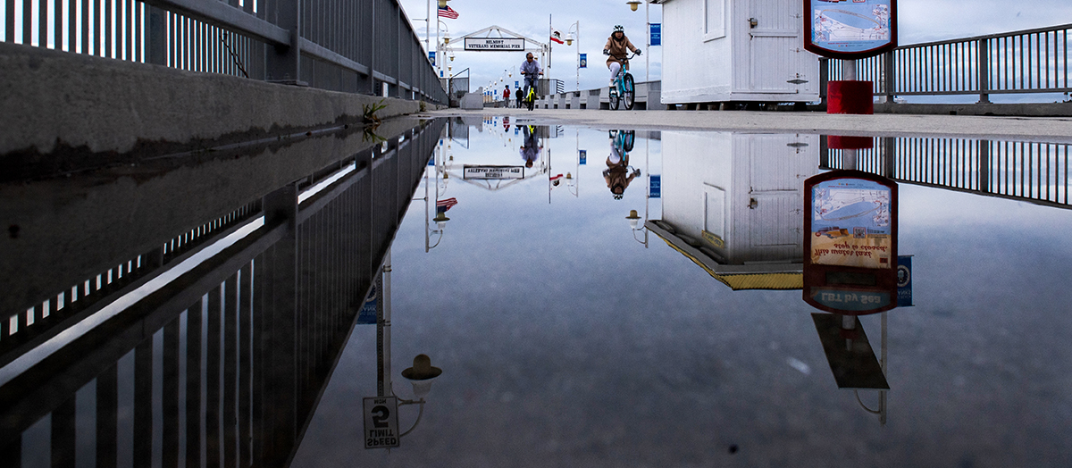 Water puddles fill part of the Belmont Pier as bicyclists ride past after a rain storm came through Southern California in Long Beach, Thursday, Dec. 21, 2023. Photo by Thomas R. Cordova.