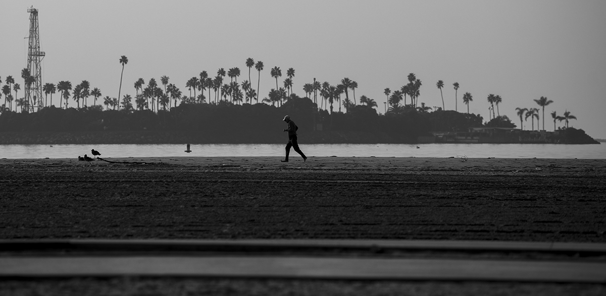 A man jogs along the beach on an early morning across from oil iland Chaffee in Long Beach, Wednesday, Dec. 27, 2023. Photo by Thomas R. Cordova.