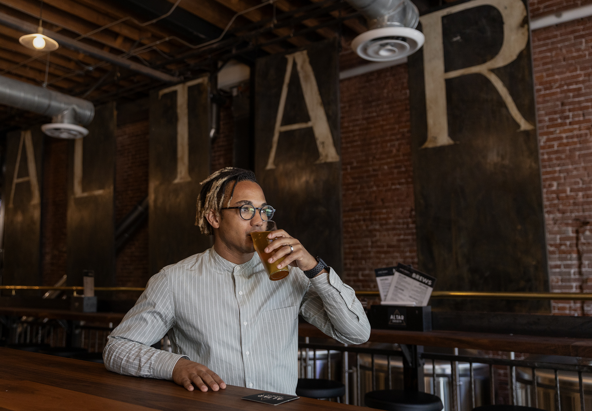 Downtown Long Beach Alliance President and CEO Austin Metoyer enjoys a Masonic Secrets grapefruit West Coast IPA at Altar Society Brewing Co. on Pine Avenue Tuesday, Dec. 5, 2023. Photo by Brandon Richardson.