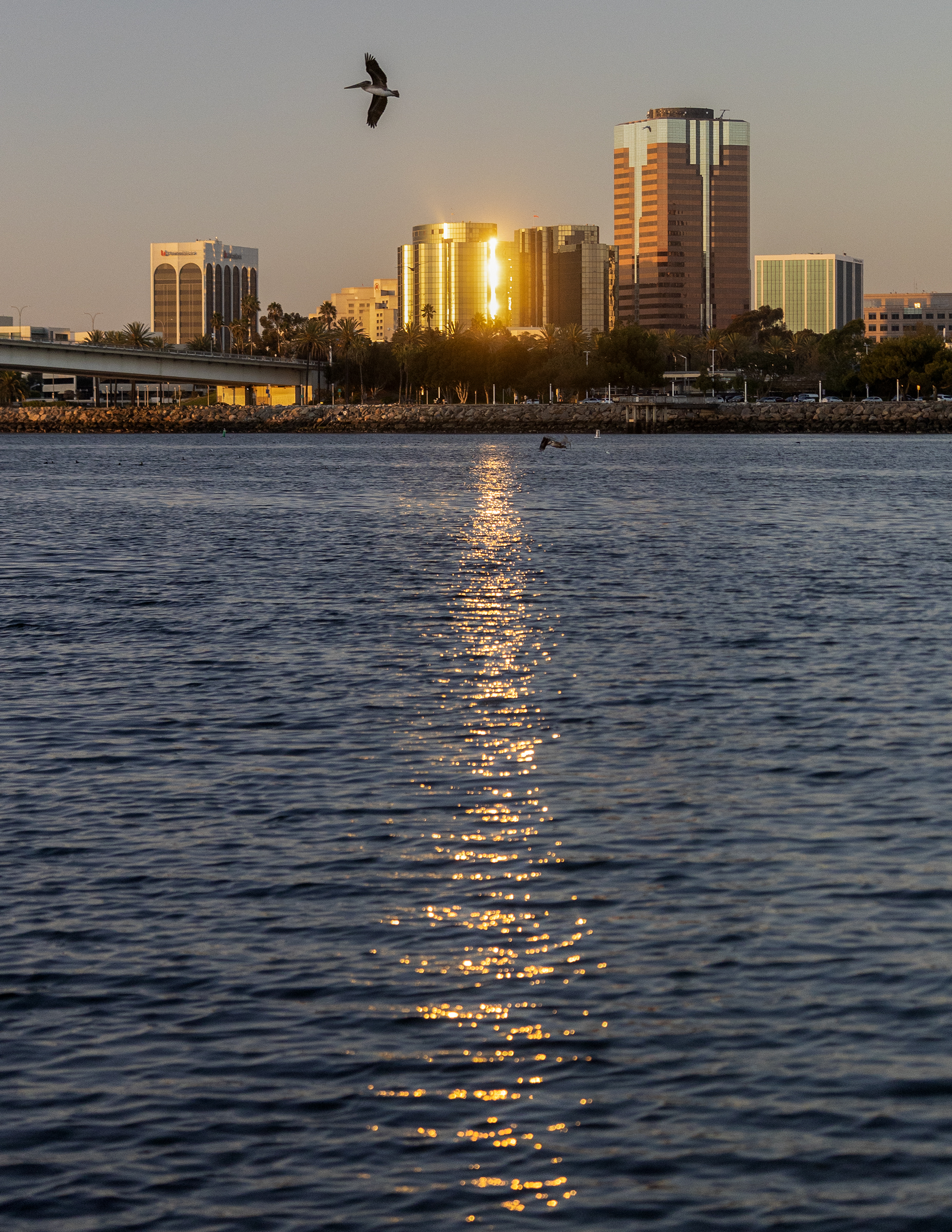 A pelican flies over Queensway Bay in Downtown Long Beach as the sun sets Wednesday, Dec. 13, 2023. Photo by Brandon Richardson.