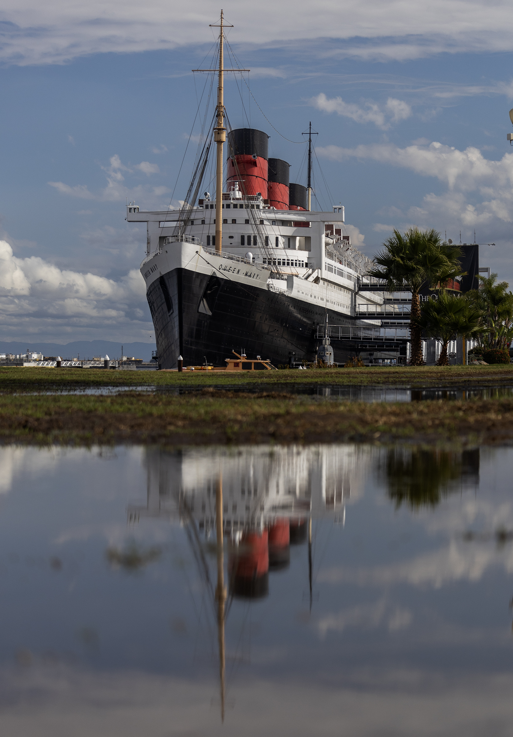 The historic Queen Mary is reflected in a puddle at Harry Bridges Memorial Park following a rainstorm Thursday, Dec. 21, 2023. Photo by Brandon Richardson.