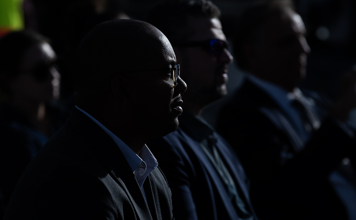 Long Beach Mayor Rex Richarson attends as officials unveil a deployment of 33 human-operated, zero-emissions battery-electric cargo-handling yard tractors aty the Port of Long Beach in Long Beach , Wednesday Nov. 29, 2023. Photo by Thomas R. Cordova.