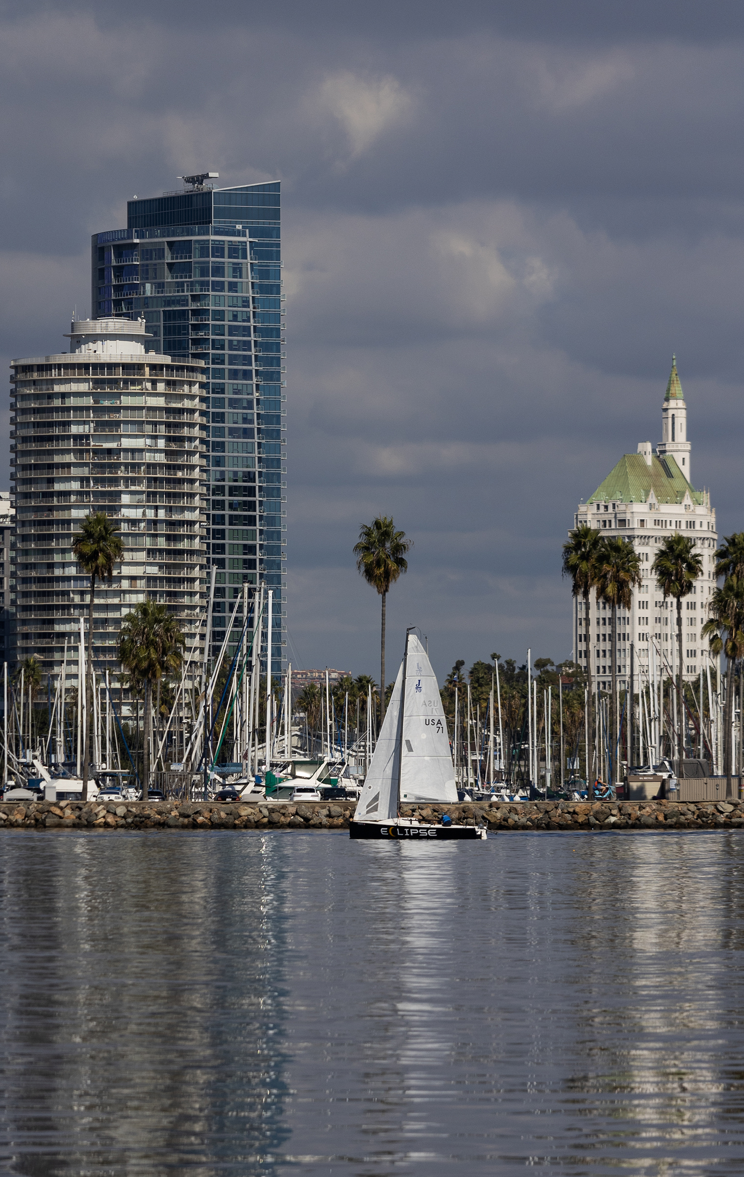 A boat sails by International City Tower, left, Shoreline Gateway, center, and the Villa Riviera Downtown Long Beach Thursday, Nov. 16, 2023. Photo by Brandon Richardson.