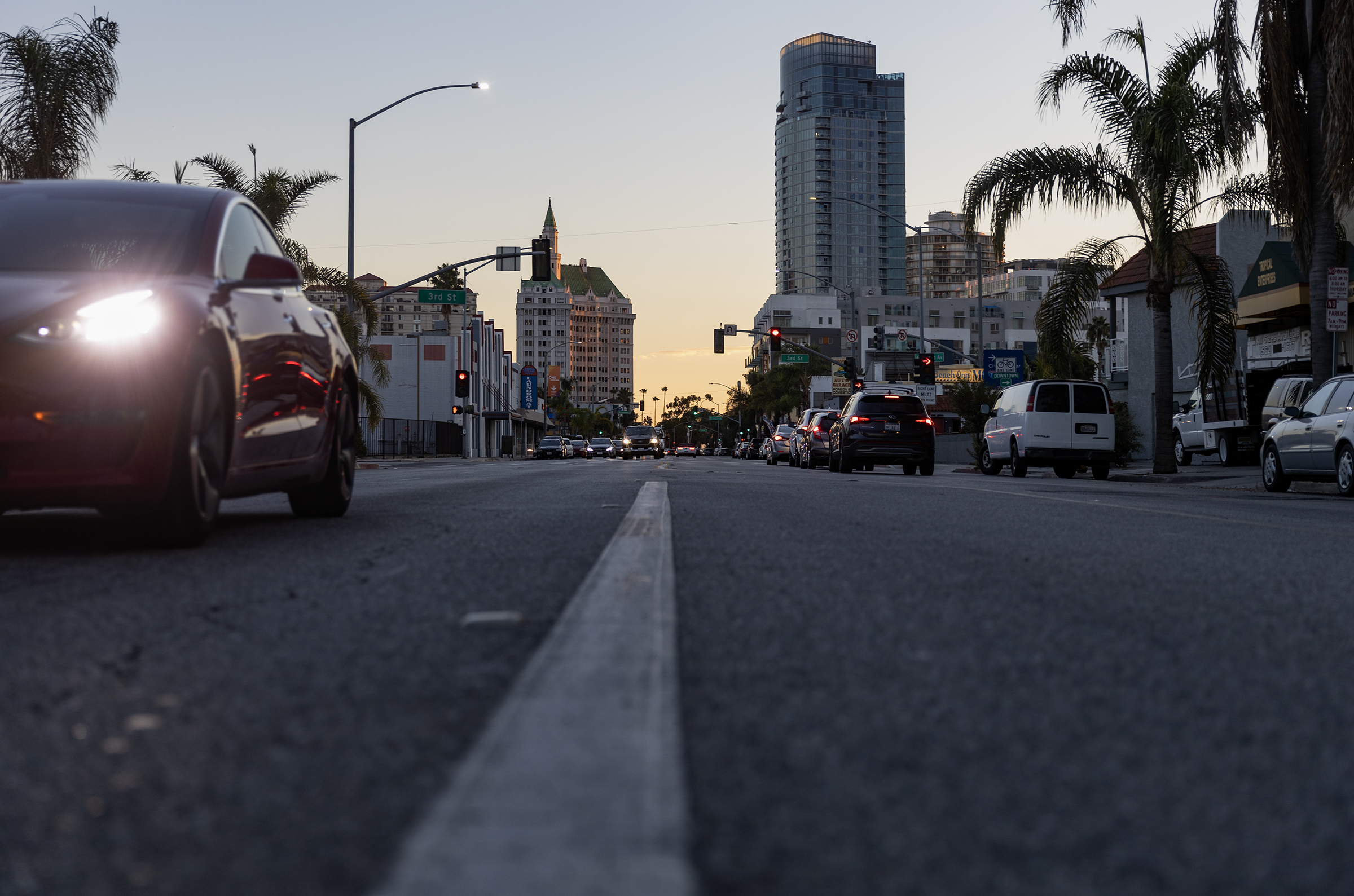 Cars drive down Alamitos Avenue at Third Street as the sun sets on Long Beach Tuesday, Nov. 28, 2023. Photo by Brandon Richardson.
