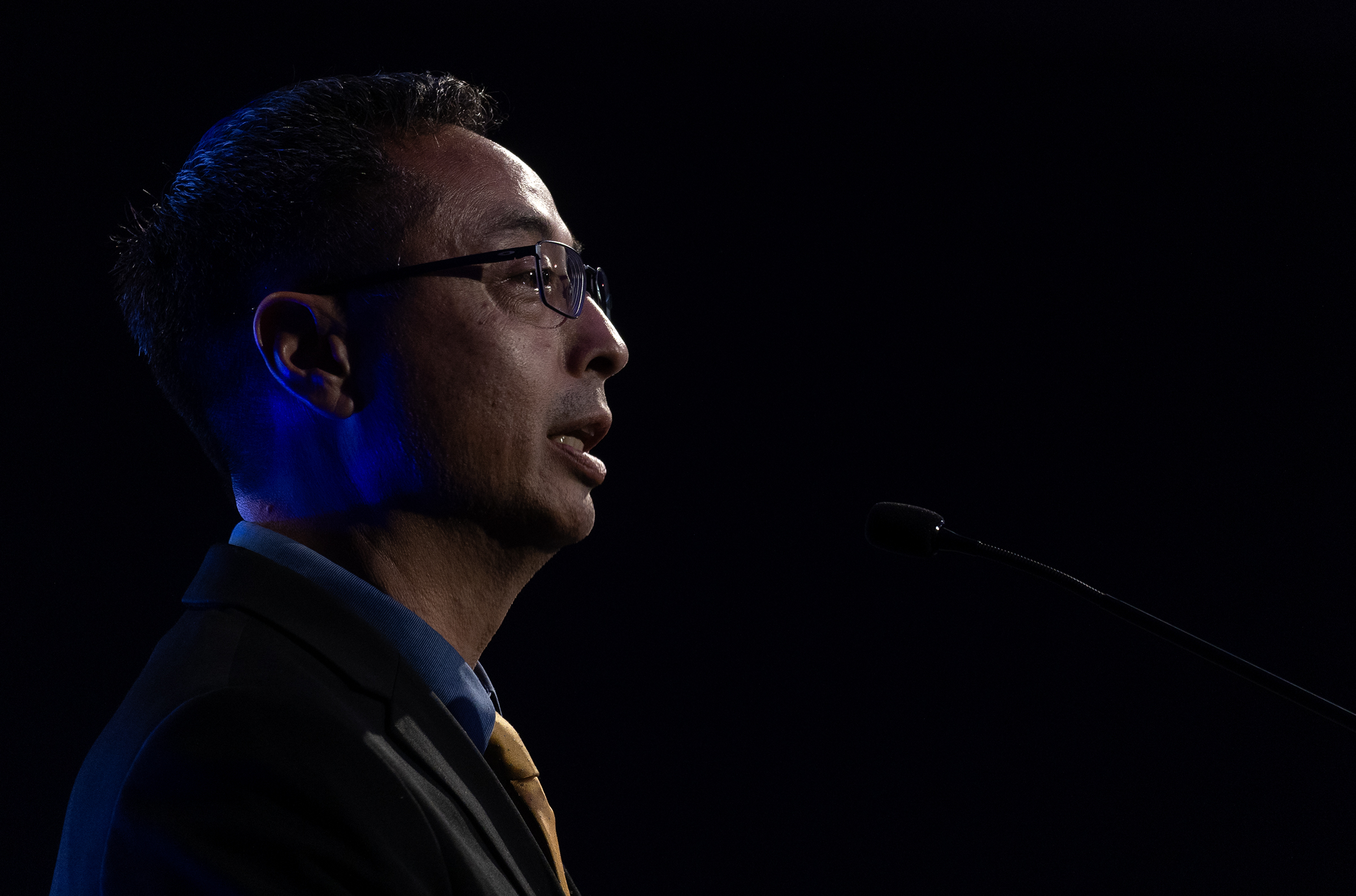 Seiji Steimetz, interim associate dean of the School of Liberal Arts at CSULB, speaks during the Accelerate Long Beach economic forum in Downtown Friday, Sept. 29, 2023. Photo by Brandon Richardson.