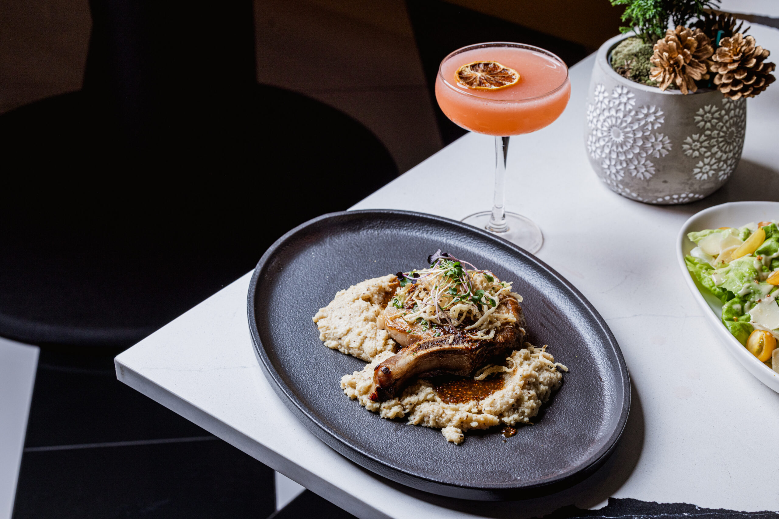 Yasu’s pork chop was inspired by a trip to New York City. The dish is served with mashed cauliflower and mushrooms. Photo courtesy of Brandon West/Vision 360 Media