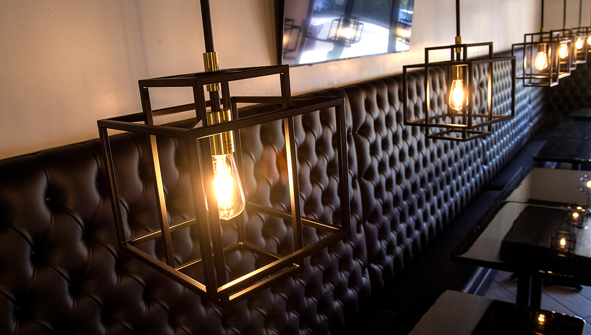 A beautiful mural of Long Beach is painted on the side wall next to the cashier, and sleek, tall, black booths give customers privacy from one another. Its design is modern with square lamps and an exposed ceiling.