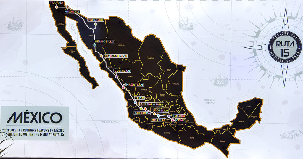 Diners who walk through the main entrance are met with a map of Mexico with key cities along Federal Highway 15 highlighted in vibrant letters. Fourteen cities — including Culicán, Mexicali and Guadalajara — are spelled out in the same colorful font on signposts displaying how far away they are from Long Beach.