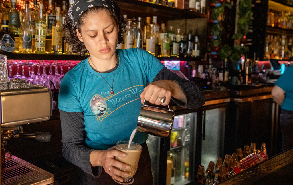 Benet Bouchard makes a Lavender Cardamom London Fog while behind the bar. Photo by Thomas R. Cordova.