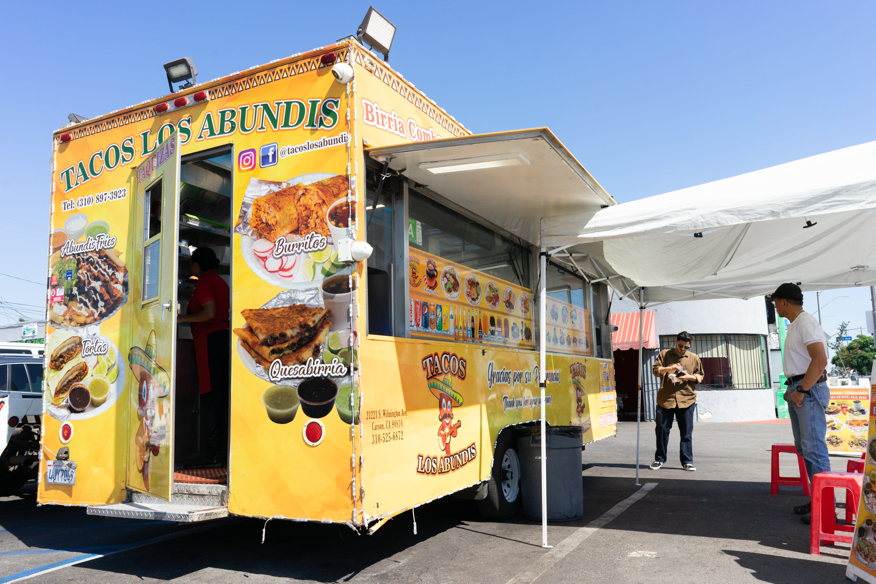 Tacos Los Abundis is a taco truck located next to a mechanic shop in West Long Beach.