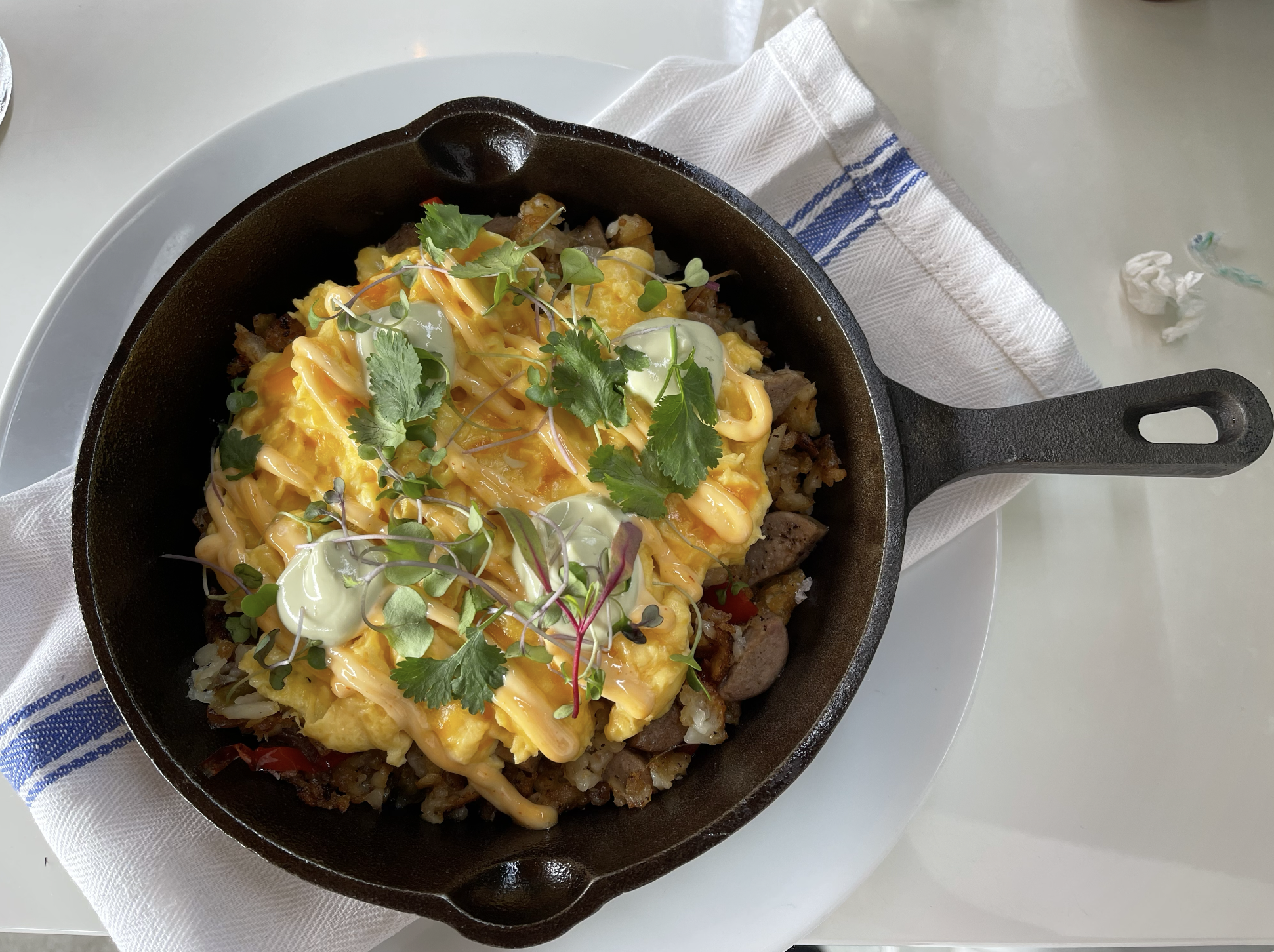 If you like a breakfast hash, The Skillet, does it well. The hash browns are crispy, the onions soft and sweet, and the red and green bell peppers are cut into thin strips so even if you generally don’t like bell peppers these will likely not be an affront to your palate. But the star of the dish is the scrambled eggs, which are soft, creamy and cheesy.