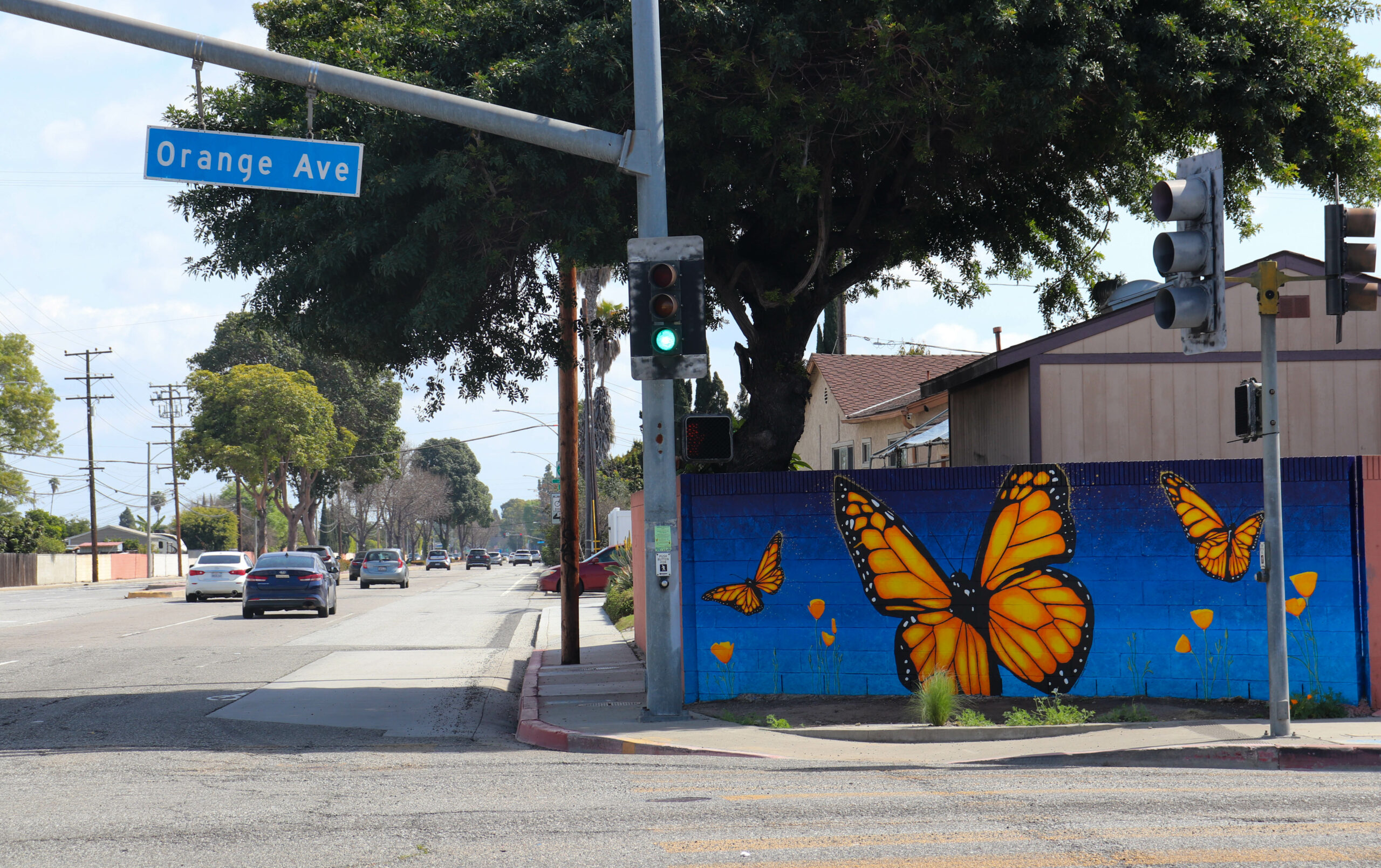 Painted across from Barton Elementary School, which is on the border of Bixby Knolls and North Long Beach, the new monarch mural was funded with the help of the city’s Neighborhood Micro Grant Program.