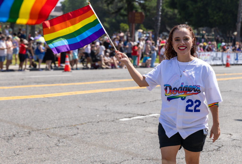 A parade-goer waves her flag during the 2023 Long Beach Pride Parade, Sunday, Aug. 6, 2023. Photo by Sarahi Apaez.