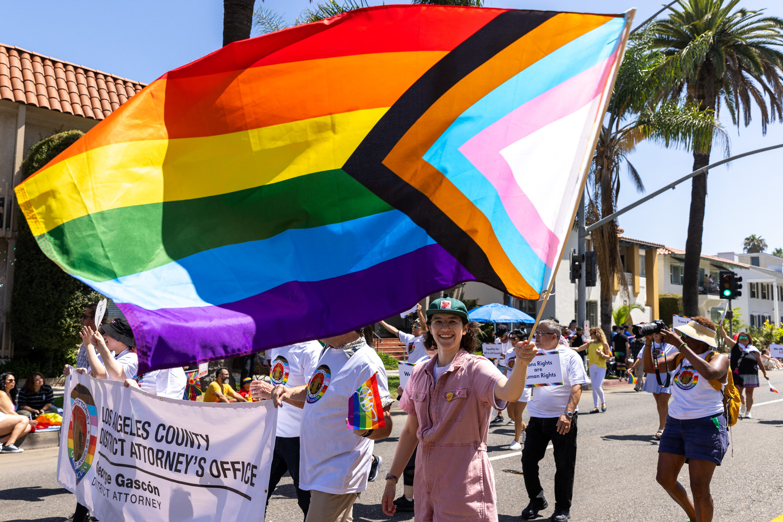 Parade participants from the Los Angeles County District Attorney’s office wave a large flag during the 2023 Long Beach Pride Parade, Sunday, Aug. 6, 2023. Photo by Sarahi Apaez.