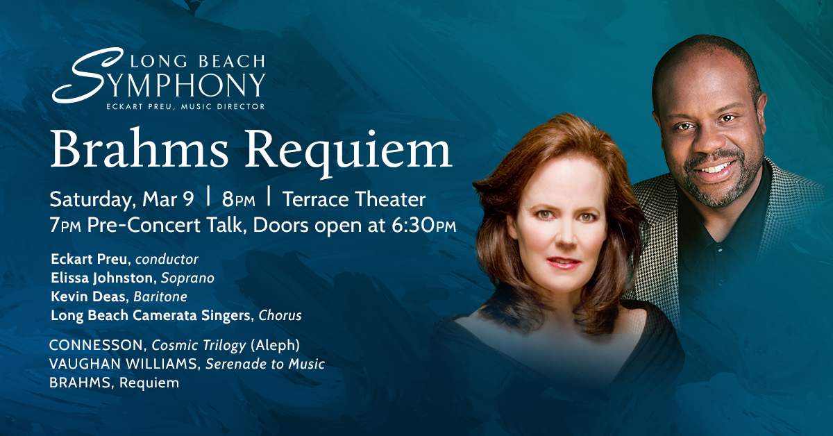 Experience an evening of spring celebration with the Long Beach Symphony at the Long Beach Terrace Theater on Saturday, Mar. 9 at 8 p.m. Delight in the music of Guillaume Connesson, Vaughan Williams, and Johannes Brahms, featuring solo performances by Elissa Johnston and Kevin Deas, alongside the Long Beach Camerata Singers and UCLA Chamber Singers.