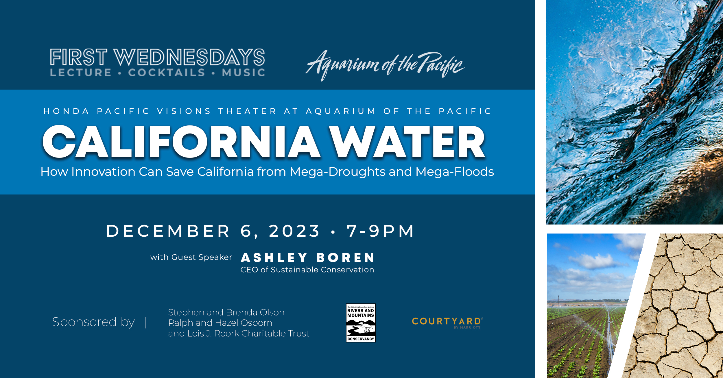Join expert Ashley Boren, CEO of Sustainable Conversation, for First Wednesdays on Dec. 6 in the Honda Pacific Vision Theater for a lecture on how to rethink the state’s water system and how we manage our priceless water resources.
