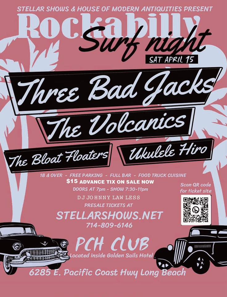 The greased-up leather jacket slingers, Three Bad Jacks, are performing live in Long Beach at the PCH club for an evening of rockabilly tunes and dancing Saturday, April 15.