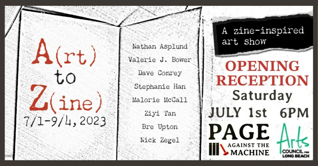 Courtesy flyer to the (A)rt to (Z)ine: A Zine-Inspired Art Show opening reception at Page Against the Machine on Saturday, July 1.