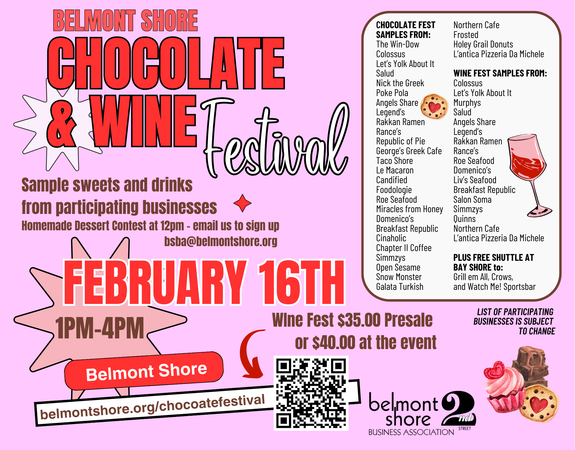 The Belmont Shore Business Association hosts its annual Chocolate and Wine Festival from noon to 4 p.m.