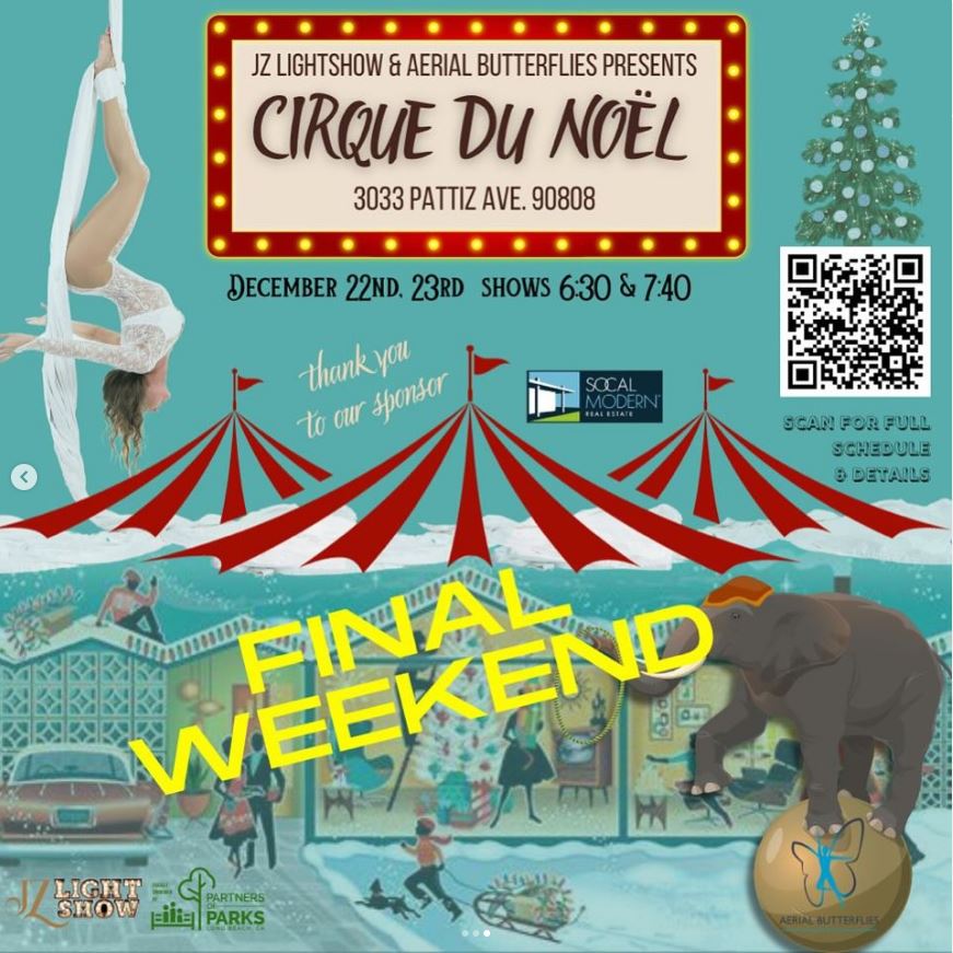 Cirque style entertainment group Aerial Butterflies and JZ Lightshow are performing a free holiday and circus lightshow at a local neighborhood on Friday, Dec. 22 and Saturday, Dec. 23 at 6:30 p.m. and 7:40 p.m.