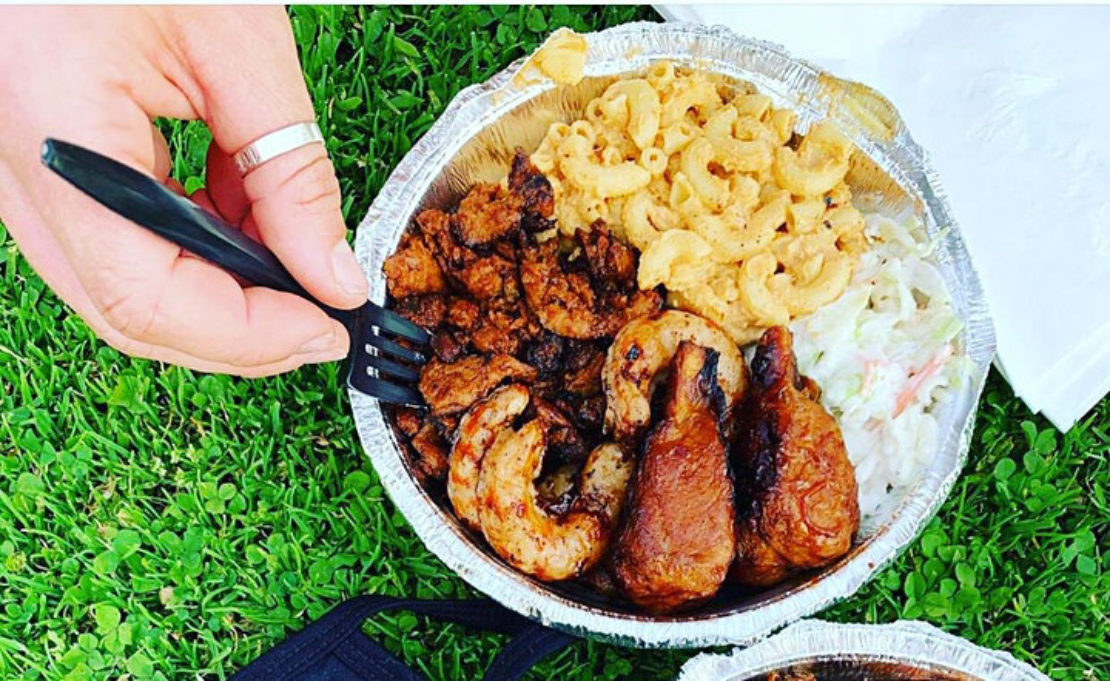 Vegan BBQ chicken and shrimp entree with plant-based mac ‘n cheese and coleslaw. Photo courtesy Leaf Over Beef. The vegan restaurant is one of six participating in the Long Beach Vegan Social at the Hawk Bar Saturday, Sept.10.