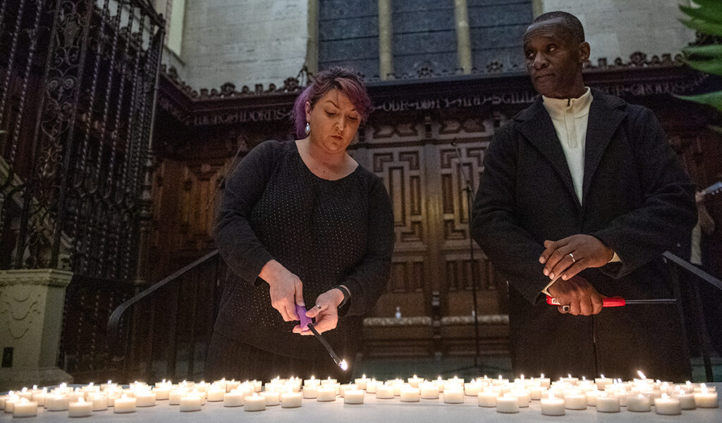 Paige Pelonis and Jamies Shuford, both of the Long Beach Homeless Coalition, lit 111 candles for the homeless who died in the city this past year in Long Beach, Thursday, Dec. 21, 2023. The 2023 Homeless Memorial took place at Forest Lawn. Photo by Thomas R. Cordova.