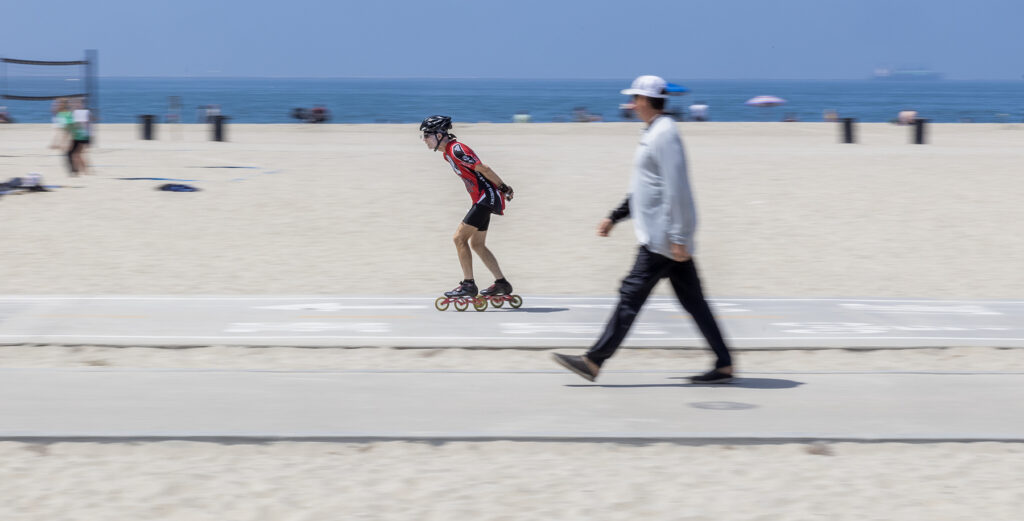 A man speed skates along the bike path at Granada Beach in Tuesday, July 11, 2023. Photo by Brandon Richardson.